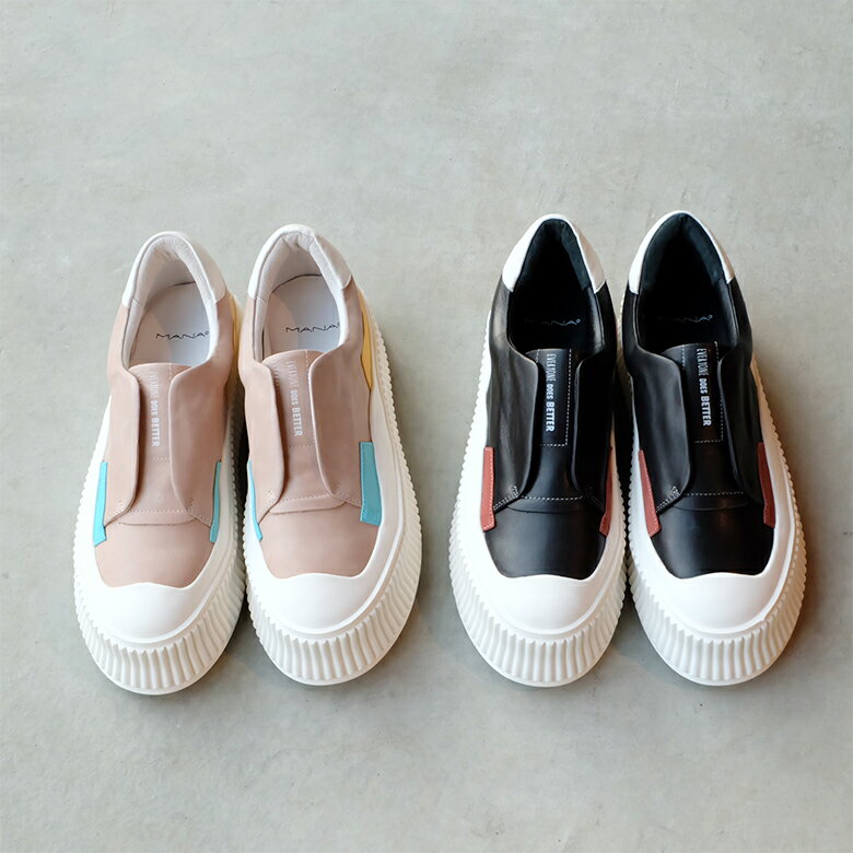 お手入れ用品 白い厚底ソールの汚れを落としに! ステインリムーバー > 汚れ防止に防水スプレー! プロテクターアルファ >MANA(マナ)/紐なし厚底スニーカー 日本人女性によるブランド「MANA (マナ)」 ユニークな形状のボリューミーな厚底スニーカーが印象的。