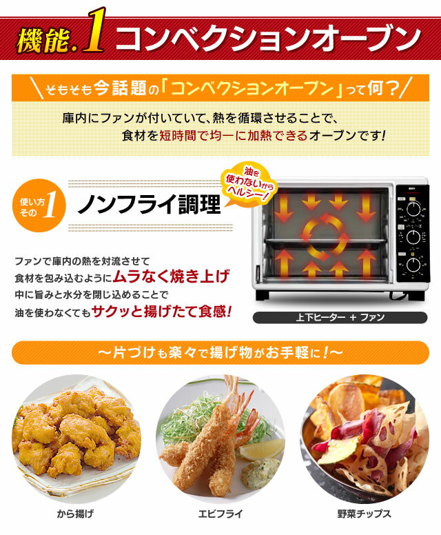 【コンベクションオーブンとは?】 ・上下ヒーターの直火だけでなく、ファンで熱を対流させて食材を包み込むように加熱! 面倒な油の処理が必要なく、ヘルシーで手間のかからない調理器です。