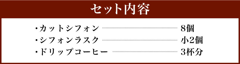 商品説明 名称 シフォンケーキ&コーヒーセット 産地 福岡県 内容量 ・カットシフォン:8個 1個当たり 高さ8〜10cm(約50〜70g) ・シフォンラスク:小2 ・ドリップコーヒー:3杯分 原材料名 ・シフォンケーキ:国産小麦、甜菜糖、グレープシードオイル、牛乳、各フレーバー(月によってごま、オレンジ、ナッツ含む場合あり 賞味期限 ・カットシフォン:お届け日含め4日間 ・シフォンラスク:消費期限は約10日 ・コーヒー:約1ヶ月 保存方法 ・カットシフォン:高温多湿、直射日光を避け冷暗所で保管ください。
